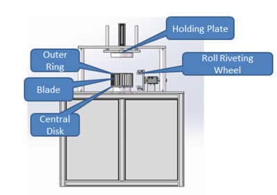 Manual put bottom ring --- Manual / Auto insert the blade per need---Manual put center ring--- Manual put upper ring ---Auto Riveting & center ring riveting---Ejection --- END, and Next cycle.